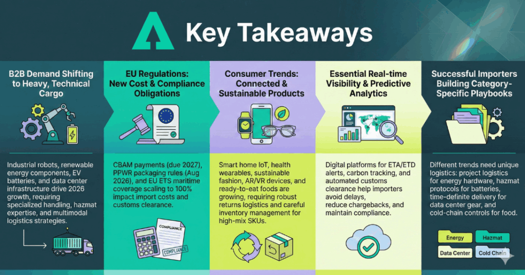 - Successful importers are building category-specific playbooks: Different product trends require different logistics approaches—project logistics for energy hardware, hazmat protocols for batteries, time-definite delivery for data center gear, and cold-chain controls for food.