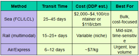 • Sea cheapest for bulk (FCL $2,000–$4,100); air urgent (~$7/kg); rail niche (15–25+ days multimodal).