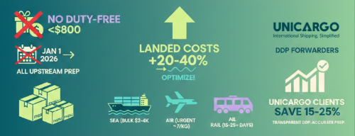 Case 1: Electronics (500 units) → Unicargo DDP sea + prep → $7k+ savings (post-de minimis duties seamless).